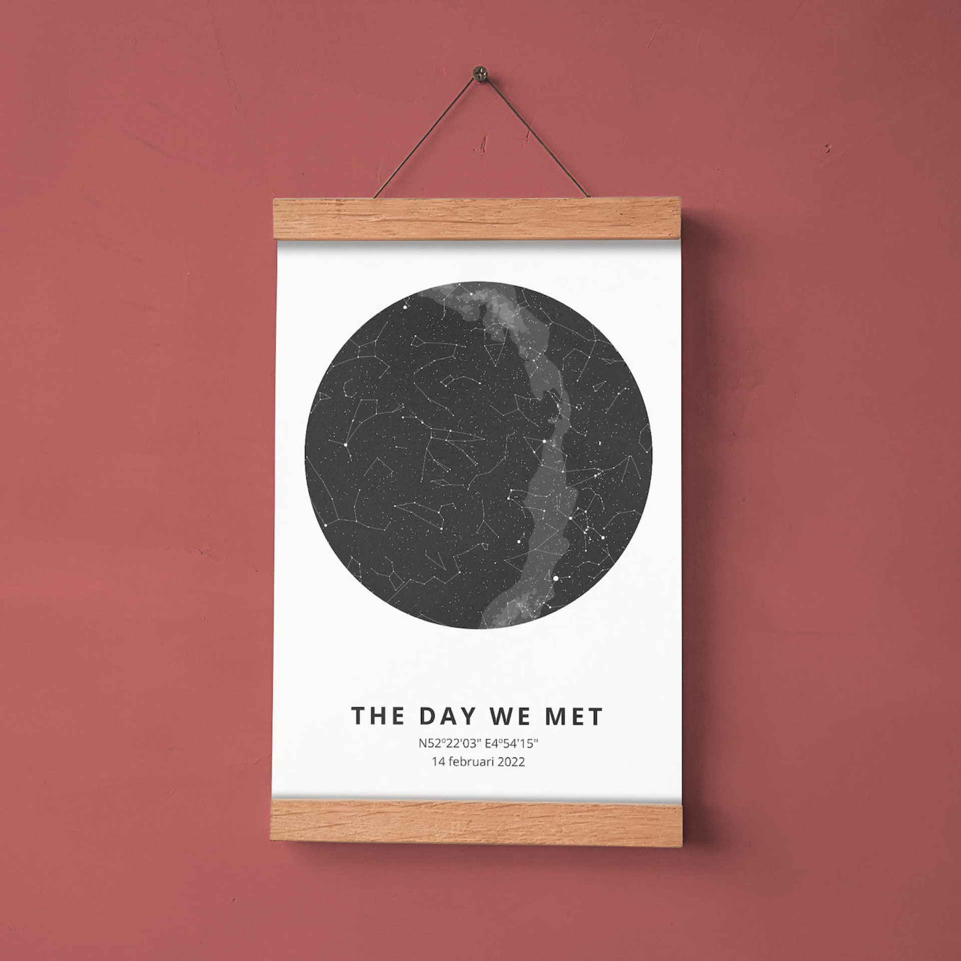 Het enige wat jij hiervoor hoeft te doen is de datum van die bijzondere dag in te vullen in onze editor en wij laten zien hoe de sterren op dat moment erbij stonden. Je kiest voor de zwart-wit poster of een van de andere elf stijlen en laat 'm afdrukken. Leuk om zelf op te hangen óf cadeau te geven. Als housewarming-, kraam- of bruiloftscadeau.